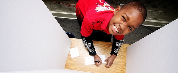 The photograph, of a third-grader voting in a mock election, is by Brittany Randolph and was used to illustrate an interview with Meira Levinson conducted by Kip M. Hustace and published in the Boston Review. See Practice Makes Citizens.