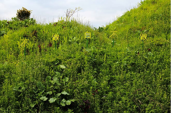 Situated in front of a Baroque castle in Kassel, Germany, and in the midst of an artificial and ordered space laid out in the sixteenth century (Karlsaue Park), the Chinese artist Song Dong’s Doing Nothing Garden was (for two years, 2010-2012) a mound of grass, flowers, and plants.[1] Here Song Dong’s garden grew approximately 6 meters high upon several layers of rubble and biological waste. In the middle of this vegetation two neon signs in Chinese characters expressed the two ideas: “doing” and “nothing.”
