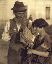 The photograph at the top was taken in Warsaw by Alter Kacyzne, and the copyright is held by the YIVO Institute for Jewish Research, which was established in 1925 in Wilno, Poland (now Vilnius, Lithuania) and subsequently relocated to New York City. YIVO preserves manuscripts, rare books, diaries, and other Yiddish sources. The Library contains more than 385,000 volumes from the sixteenth century onward, and the Archives holds more than 24 million documents, photographs, recordings, posters, films, and other artifacts.
