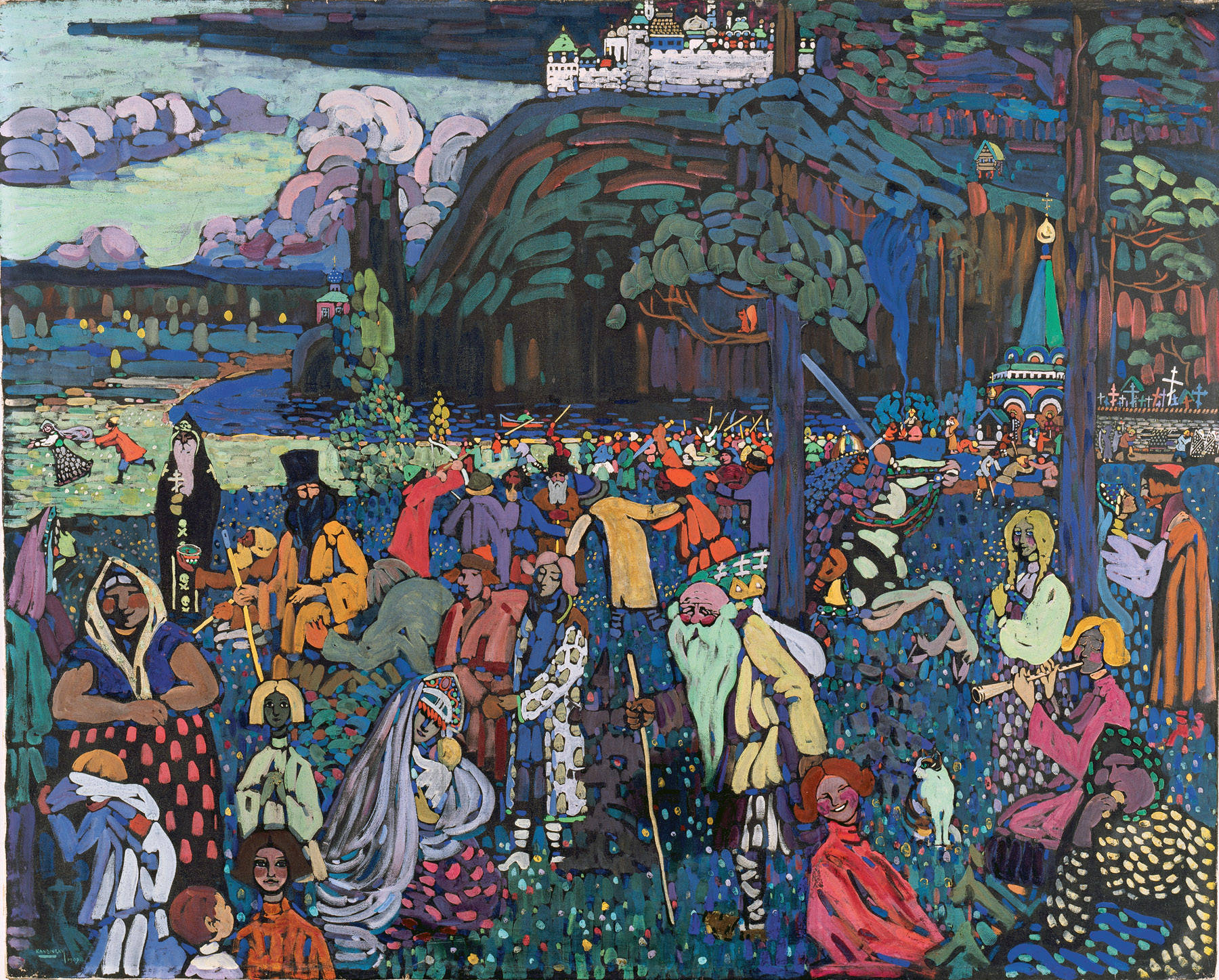 obscured the true complexity of the artist’s development, but worse, it obscured its inherent continuity expressed both in formal stylistic terms…and, far more significantly, in terms of iconographic content and meaning. At the same time, this “formalist” approach also conveniently ignored such early paintings as “Song of the Volga” and “Motley Life” [featured below]. Together with a number of other works often referred to as the “Russian paintings,” these works often remained somewhat of an embarrassment, given short shrift in an art historical literature concerned more with the Western idea of “abstract painting” than with the visual evidence of Kandinsky’s lifelong commitment to his Russian heritage that sustained the continuity of his entire life’s work.