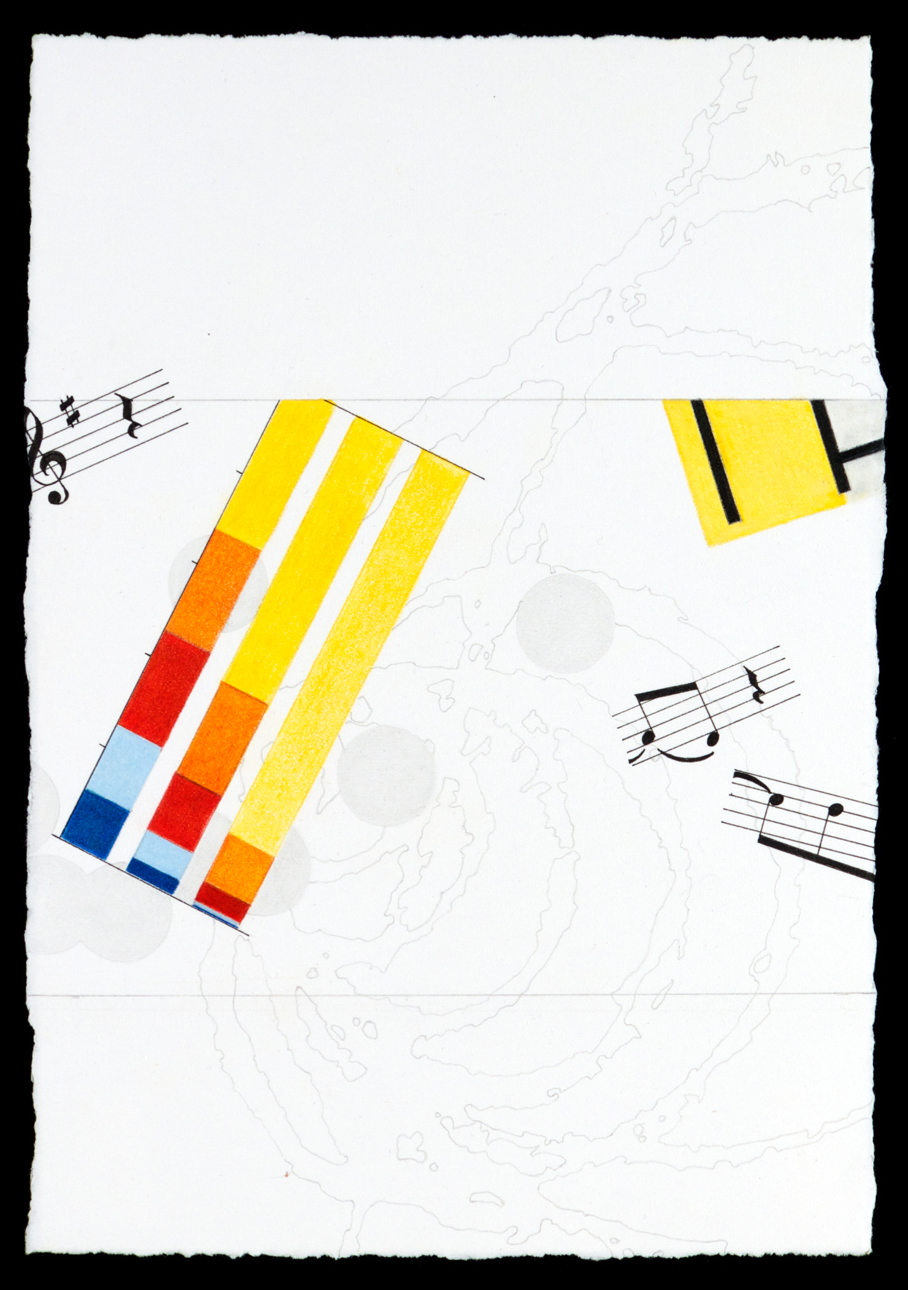 In one drawing (#36) Gohara has set up a contrast between the bottom left corner of a Mondrian painting that appears on the right, as if dropping from the space of heaven, with a yellow field marked by black lines, and, on the left, a bar chart of predominantly primary colors that echoes the geometry and divided space of the painting. The chart illustrates the difference between people’s perception of who shares the wealth and the actual stark reality. The suggested lyricism of the random musical notations makes for an uneasy juxtaposition. In another drawing (#12) the newspaper clippings with their endless stories of death are below a Malevich painting, a square divided into four alternating black and white squares. Malevich symbolically obliterated past references to religion with black and white paint for a new modern vision of infinity and transcendence. He called his movement Suprematism for the purity of his supreme (complete) transformation/destruction of traditions. His flat black/white squares referenced Byzantine icons and their perceived inherent spiritual power.