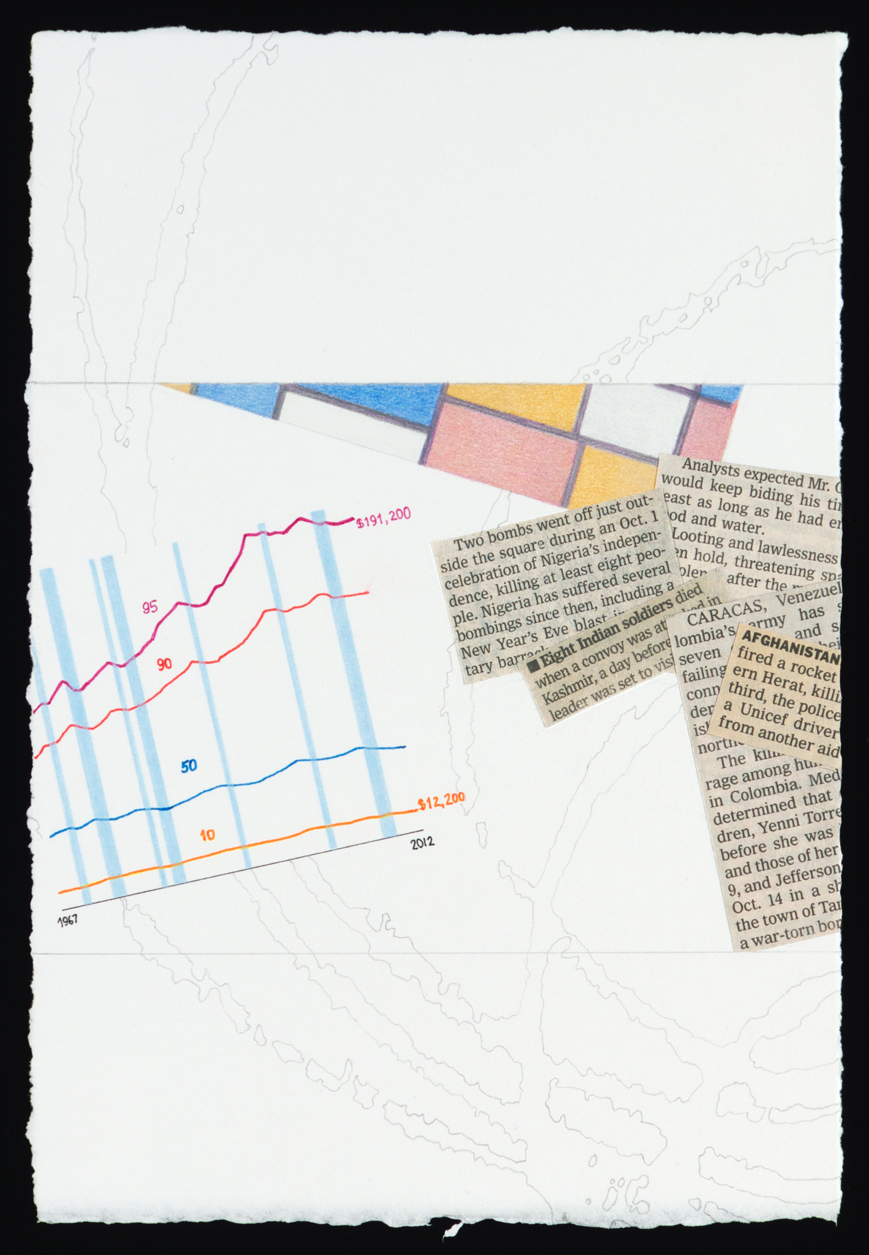 A graph of income stagnation among different income classes from 1967 to 2012 shows that while the four groups depicted have seen no growth in income over the past decade, the incomes of those in the 50th percentile or lower have, over many more years, hardly changed. The found colors of the graph reflect those in a reproduction of a Mondrian painting that edges in from above. News clippings of reports of deaths from political violence echo the blocks of color in the geometric painting, though the content is far different.