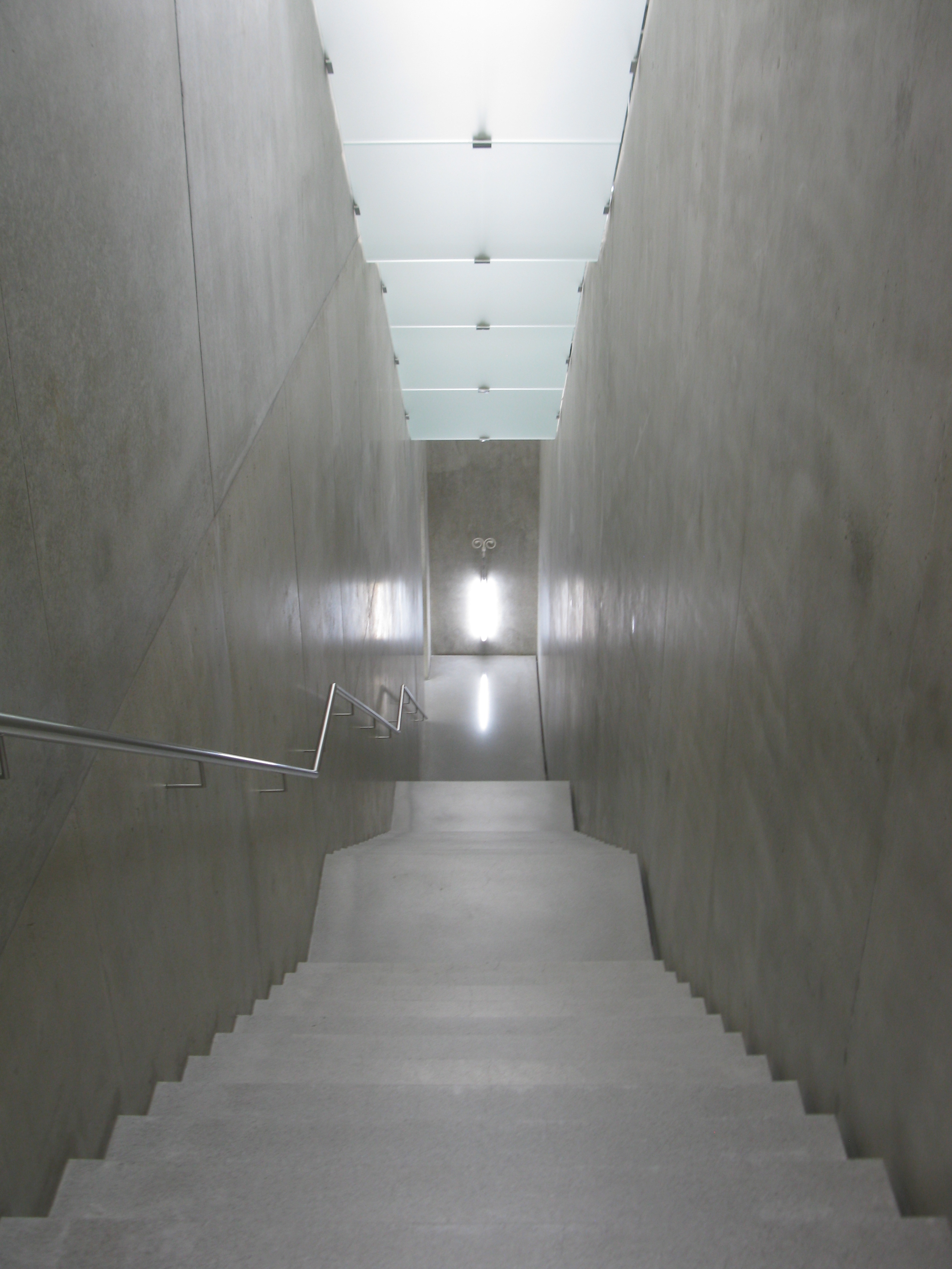 I have had the opportunity to visit Kunsthaus Bregenz (called KUB) twice—in 1999 and again this year. Built in 1990-97 by Pritzker Prize winning Swiss-architect Peter Zumthor, the Kunsthaus is, I think, the perfect combination of proportions, materials, and atmosphere that allows the art to breath and the visitor to feel transfixed and absorbed in a space distinct from the outside. Located, like a ghostly presence, in a small town in Austria near the shore of Lake Constance (the Bodensee), it’s not on every tourist map but for a lover of art and architecture a worthy destination and conveniently within a few blocks of the train station. Its cubic-minimalist form has a skin of 712 etched-glass panels that are held together by metal clips and attached to a steel framework. This freestanding façade allows light to flow into the galleries and cover the ceilings. At night the glass panels become transparent and one can see the outline of the interior structure. In contrast to the fragile glass exterior, the interior, floors, walls, and stairs, are unpainted concrete. Artists are invited to exhibit works specifically made for this cocoon-like space.