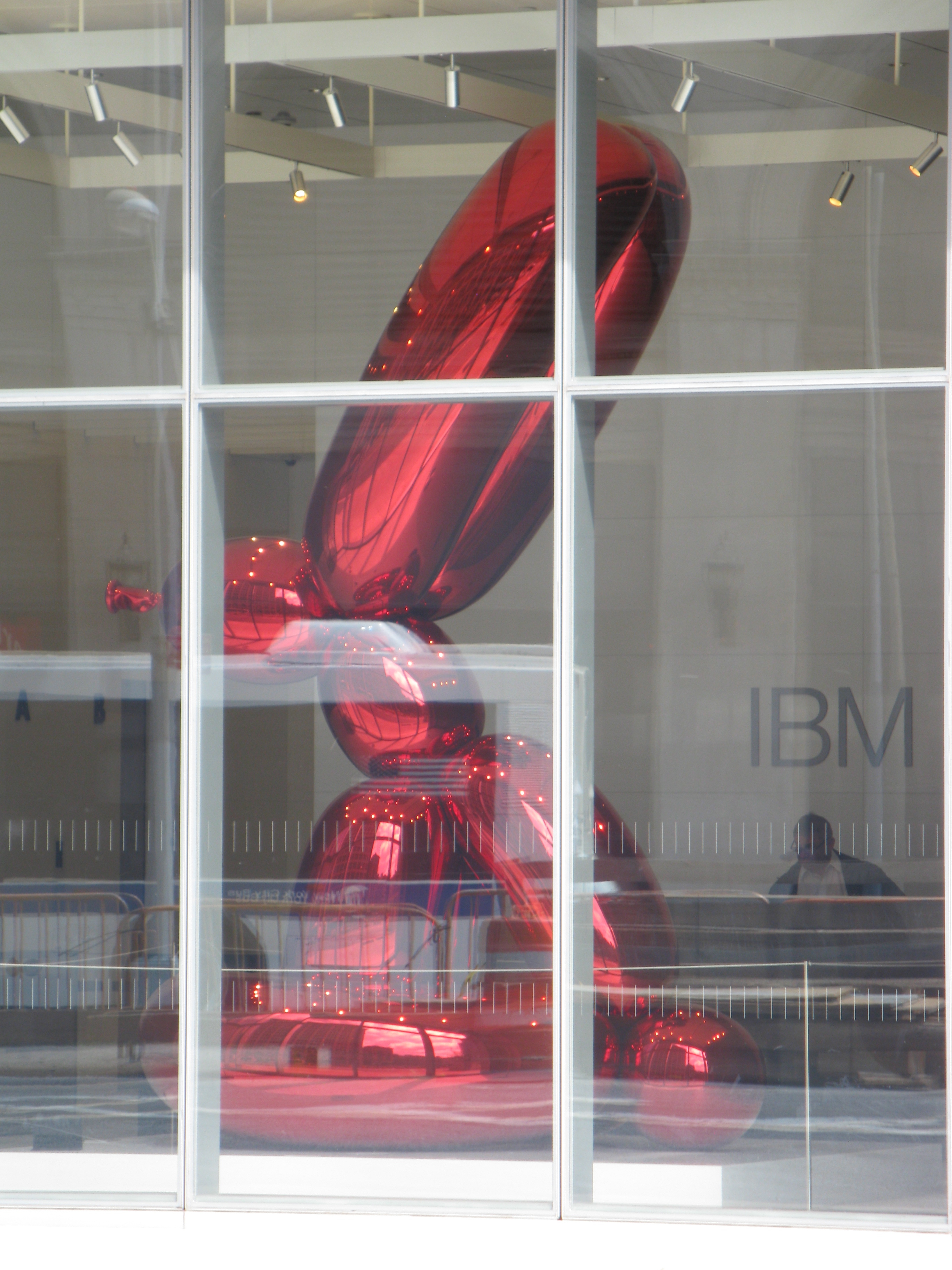 Inside the lobby of IBM Watson sits a Jeff Koons Balloon Rabbit sculpture—of red stainless steel polished to perfection and off-limits to any interaction with passersby. On a weekend, the doorman/guard refuses to allow entrance to view or photograph the sculpture. One can only take photos from outside. The lovable bunny in all its pristine glory and worth many millions of those is protected by, of course, bullet-proof glass. To support himself as an artist in the early 1980s, Koons sold mutual funds and became a commodities broker. A lot has been made about his Wall Street beginnings and not without irony.