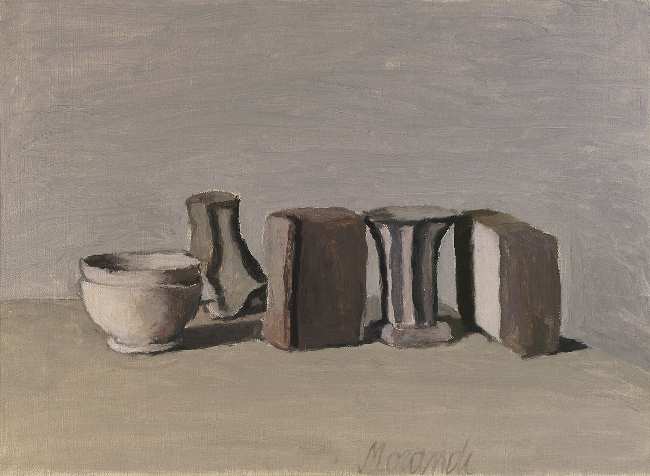[21] N.B.: Morandi was hardly the first person to paint such paintings. One might see, for example, from seventeenth century Spain, Francisco de Zurbarán’s Bodegón (or Still Life with Pottery Jars), or wider-ranging examples of paintings of musical instruments and music, of letters and writing instruments, or, say, Fernand Léger’s 1921 Nature morte à la chope (Still Life with a Beer Mug).