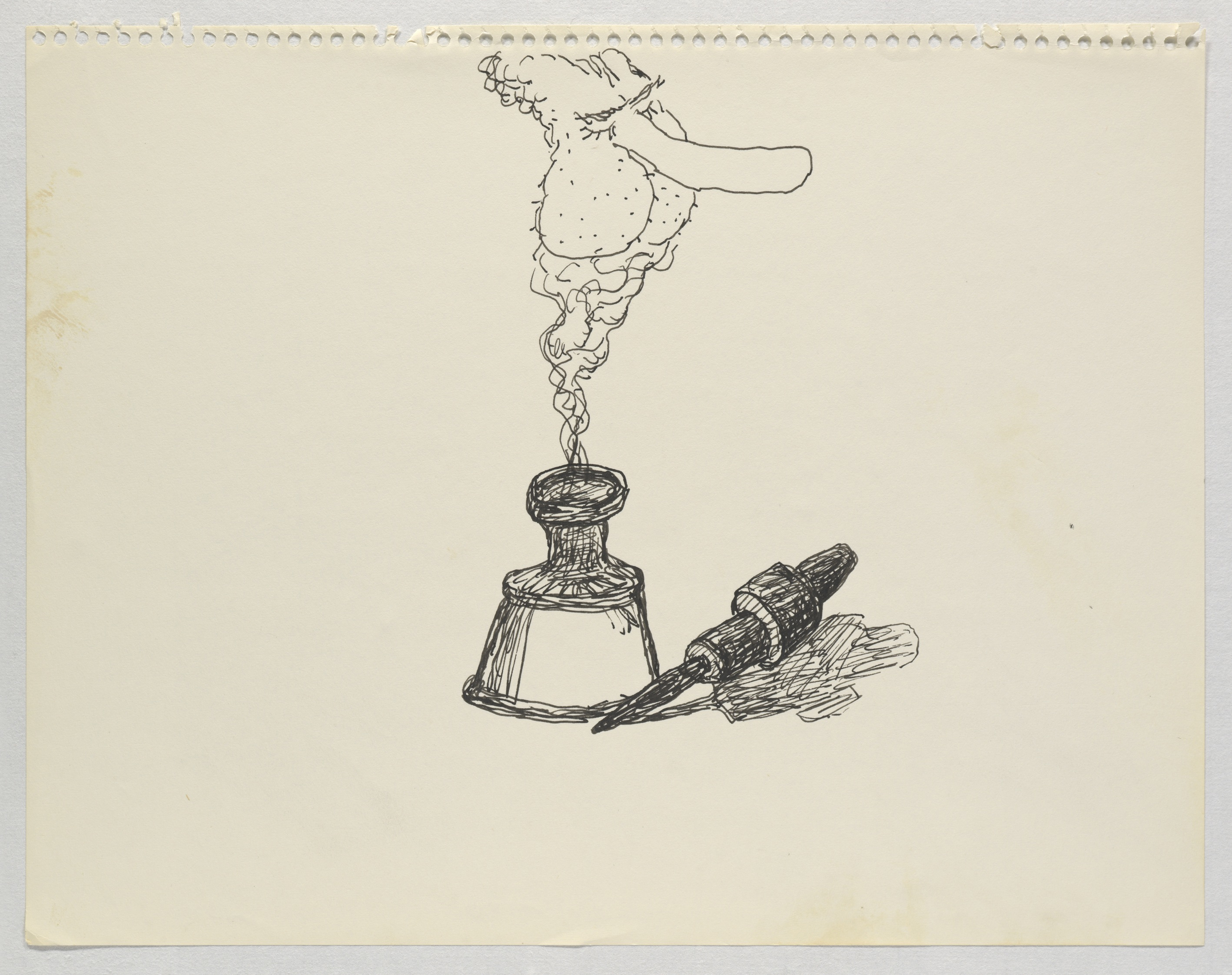 Face above ink bottle: Philip Guston, Untitled, 1971. Ink on paper; 27.6 x 35.2 cm = 10 7/8 x 13 7/8 in. Private Collection. © The Estate of Philip Guston, Courtesy Hauser & Wirth [GUSTO77563]
