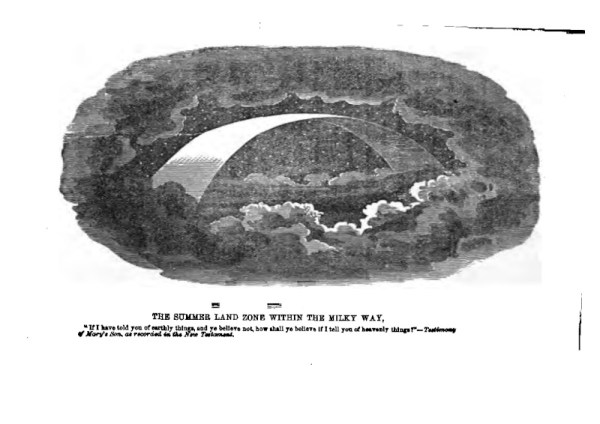 In the Summerland, spirits did not face the threat of going to hell or being trapped in purgatory. Instead, spirits would enter the lowest sphere and would rise successively as they attained knowledge and wisdom about earthly and heavenly affairs. The progress through the spheres of enlightenment in the Summerland again reflected Spiritualism’s emphasis on progress. As S.E. Park explained, “Spirit-life is but a continuation of mundane-life; the mind or spirit is the same; no change is produced by its leaving the body; and it remains the same, until, by our own exertions, advancement commences.”[42] Therefore, in many ways, the afterlife was a continuation of earthly life, as habits, relationships, and occupations carried over—as did race.