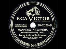 “Managua, Nicaragua,” 1946; written by Irving Fields, the lyrics by Albert Gamse; the recording by Freddy Martin and His Orchestra reached the Billboard best-seller chart on January 31, 1947 and lasted 11 weeks on that chart, peaking at #1.