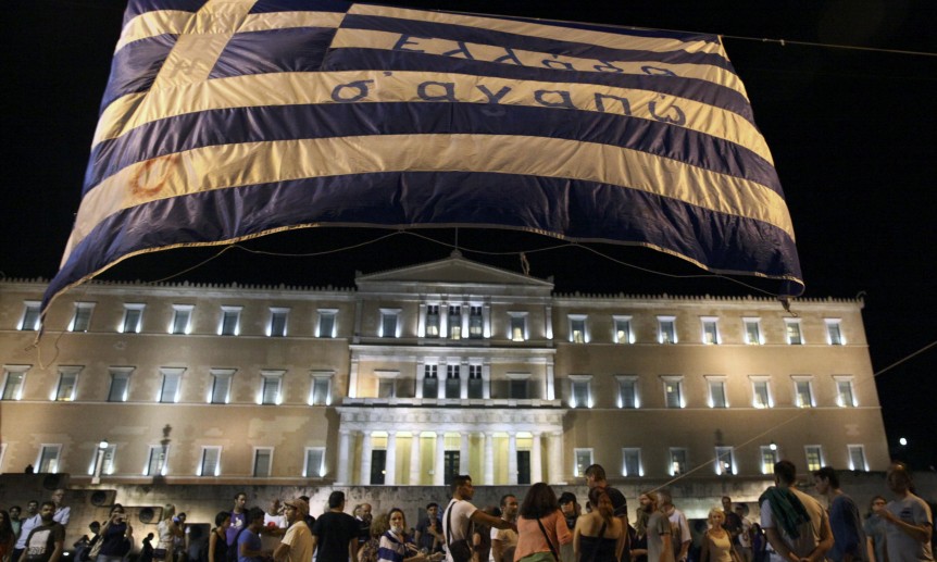 Anti-austerity protesters lift a Greek flag in front of the Greek Parliament in Athens ← Previous Next → Anti-austerity protesters lift a Greek flag in front of the Greek Parliament in Athens, Greece July 15, 2015. REUTERS/Yiannis Kourtoglou