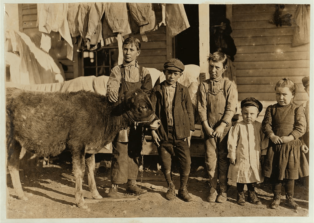 Photo 317. Sarah Hine’s caption: “Wylie Mill, Chester S.C. Boy with calf is Pimento Benson. Raising it for beef. Has worked in mill 2 years. Mr. Benson said, “Just as soon as the boys get old enough to handle a plow, we go straight back to the farm. Factory is no place for boys.” Next to Pimento is Ray Benson. Helper in the mill. Next, Clarence Rust, works in the mill.”