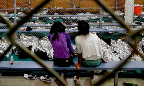 FILE – In this Wednesday, June 18, 2014, file photo, two young girls watch a World Cup soccer match on a television from their holding area where hundreds of mostly Central American immigrant children are being processed and held at the U.S. Customs and Border Protection Nogales Placement Center in Nogales, Ariz. As of Thursday, July 17, 2014, immigrant children caught crossing the Mexican border into Texas illegally and alone are no longer being sent to a massive Nogales facility. (AP Photo/Ross D. Franklin, Pool, File)