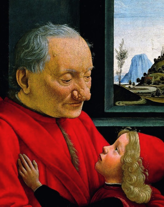 llustration d’un rhinophyma, c’est-à-dire d’un nez prononcé, bulbeux et sanguin. Outre cette déformation, le tableau de Ghirlandaio est majestueux. Tout se joue dans le regard entre le vieil homme et l’enfant. Un regard attendrissant, rempli de compassion. En quelque sorte, cet échange est un hymne à la rencontre intergénérationnelle. À la compréhension.