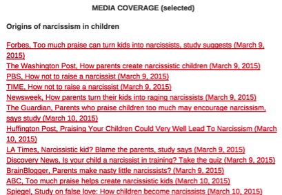 narcisissm 3 ← Previous Next → Screenshot of one section in the leading researcher’s website, where he reports an extensive list of news coverage.